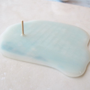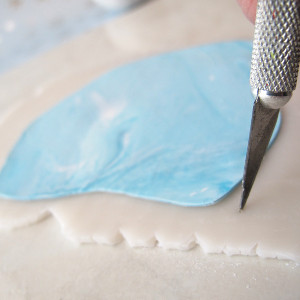 - Mix together ¼ of a bar of White and Turquoise clay. With the Clay Conditioning Machine on the #6 setting, create a sheet. From the sheet, cut a free form “ice flow” shape with your Exacto knife.