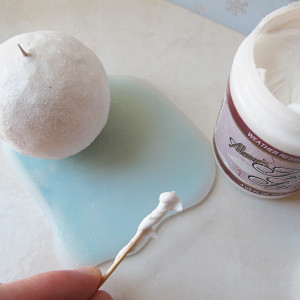 - Use a toothpick to create a little snow frost on your ice base using 3-D snow paint (like Aleene’s True Snow). Before the paint dries, add a dusting of glitter. Set it aside to dry.