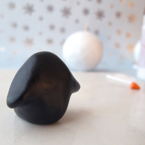 - To make the body of the penguins, roll a black oval approximately 1”. Press down on one end of the oval so it will stand by itself. With your fingers, lightly sculpt out your penguin’s tail and two wings by pulling the clay and squeezing.