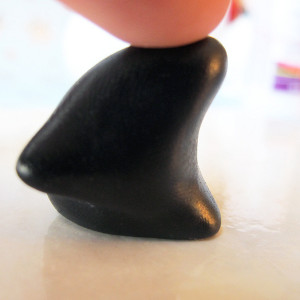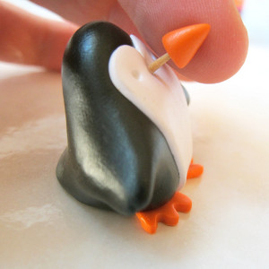- Before you attach the beak, cut a small piece of toothpick and cover the end with the Bake and Bond and insert it into the face. Attach the orange beak to the toothpick.