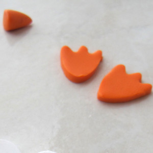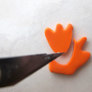 - With the Clay Conditioning Machine on the # 3 setting, roll ¼ of the Orange bar into a sheet. Use the mini-metal hand cutter from the Premo! Baby Set to cut out your penguin’s feet. Remove the pointer finger and thumb of the hand with an Exacto knife so that the penguin will have three toes. Note: If you don’t have the mini hand cutter, you can just cut out feet shapes with a knife.