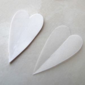 - With the Clay Conditioning Machine on setting #5, create a sheet of White clay from ¼ of the bar. Cut out a long and thin paper heart template approximately 1 ¼" tall for the penguins’ body. You can also cut out the shape by hand.